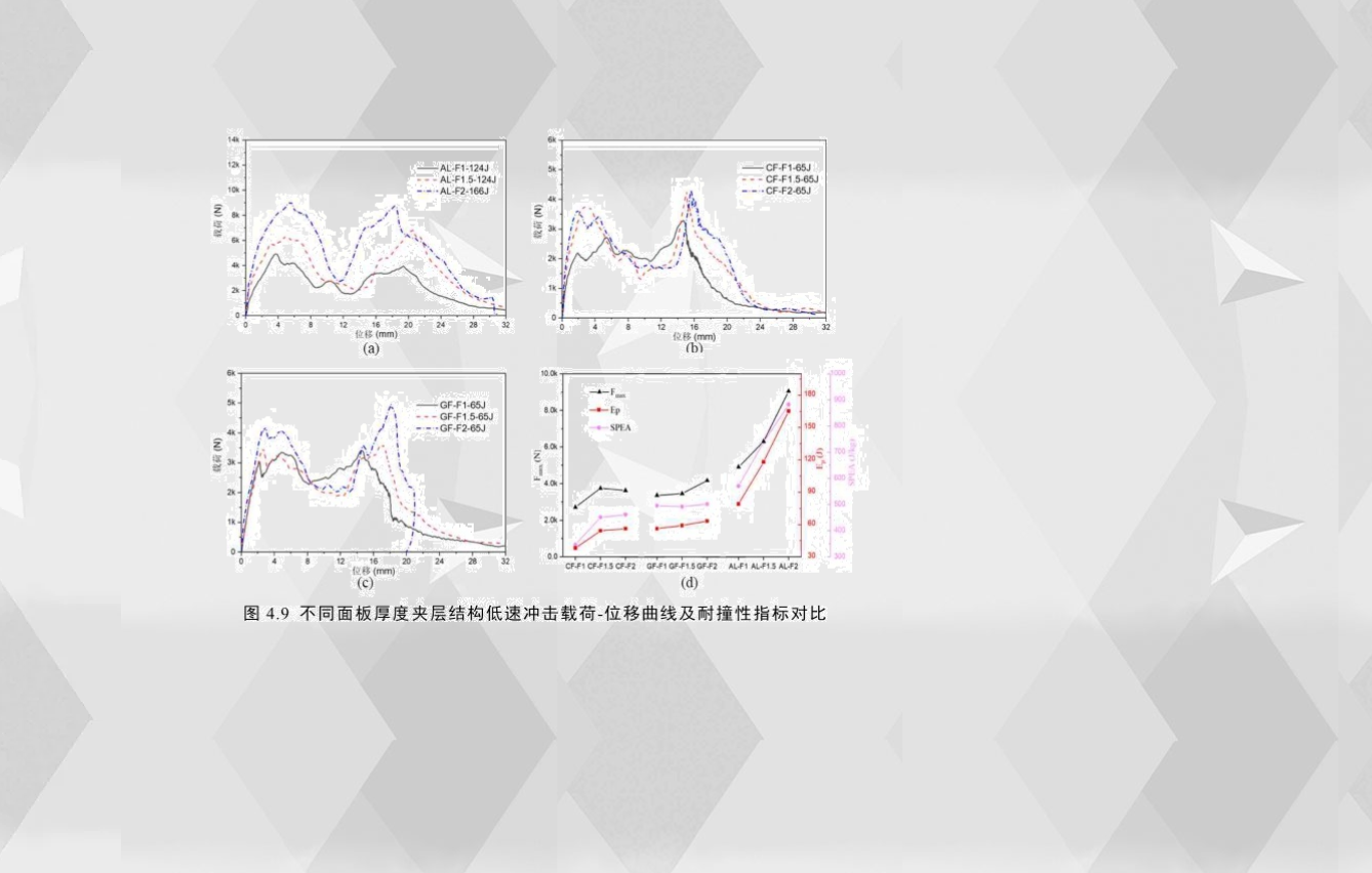 為了研究夾層結(jié)構(gòu)的面板厚度對沖擊性能的影響,圖4.9(a)-(c)比較了三種不同面板厚度的夾層結(jié)構(gòu)的載荷-位移曲線。無論是彈塑性面板還是脆性面板,夾層結(jié)構(gòu)的面板厚度對其低速沖擊響應均有較大影響。為了更直觀地比較,圖4.9(d)對比了不同面板厚度夾層結(jié)構(gòu)的耐撞性指標,通過觀察,鋁合金夾層結(jié)構(gòu)的耐撞性能隨面板厚度增加而明顯增加,面板厚度從1mm增加到2mm其初始峰值載荷、穿透吸能和比穿透吸能分別提高了84%、108%和54%;對玻璃纖維夾層結(jié)構(gòu)而言,當面板厚度從1mm增加到2mm其初始峰值載荷和穿透吸能分別只提高了24%和13%,而面板厚度的增加對比穿透吸能的影響效果差異不大;而對碳纖維夾層結(jié)構(gòu)而言,當面板厚度從1mm增加到2mm,其穿透吸能和比穿透能分別提高了42%和33%,并且隨著層數(shù)的增加,耐撞性指標增加的幅度大幅減小。